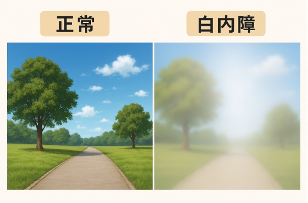 白内障では、水晶体が濁ることで光が乱反射し、視界が白っぽくかすんで見えるようになります。代表的な見え方の変化は以下の通りです。